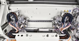 Подача заготовок на кромкооблицовочный станок осуществляется с помощью шарнирно-сочлененного робота, который самостоятельно загружает их на рабочий стол.