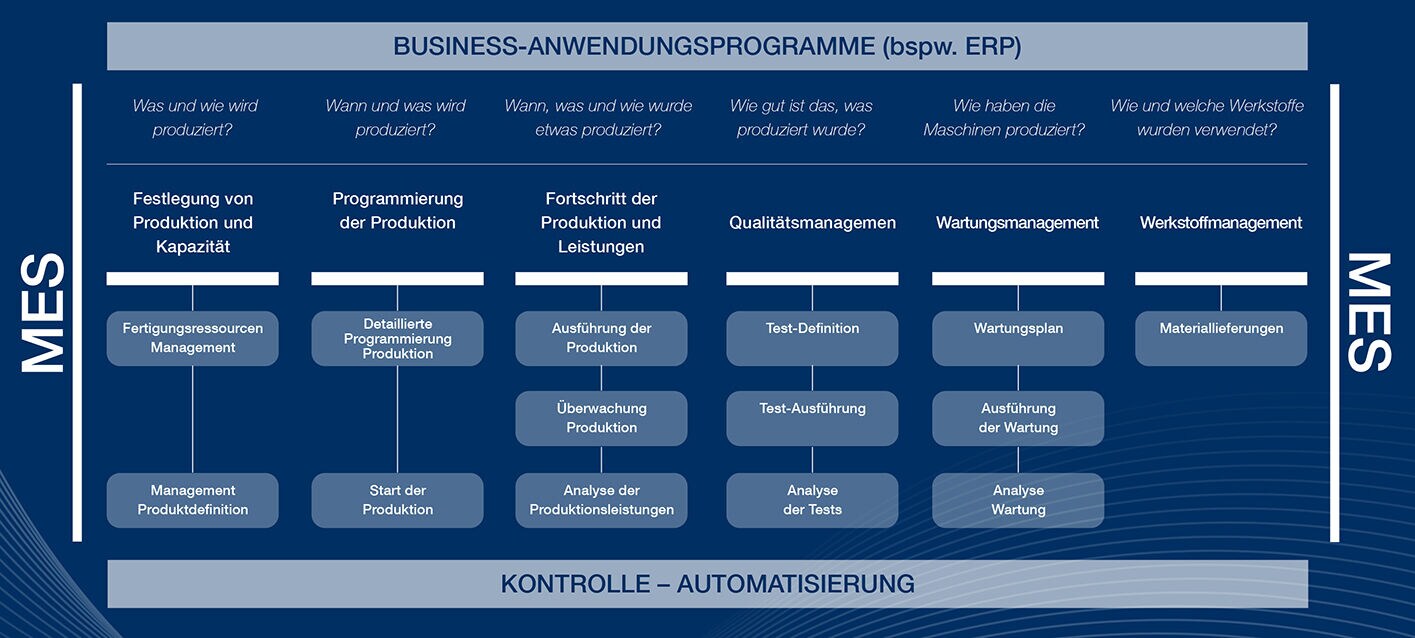 Beim MES handelt es sich um ein Werksinformationssystem. Dieses verwaltet und steuert den gesamten Produktionsprozess von der Auftragsfreigabe bis hin zum fertigen Produkt, um eine optimale Produktion zu gewährleisten.