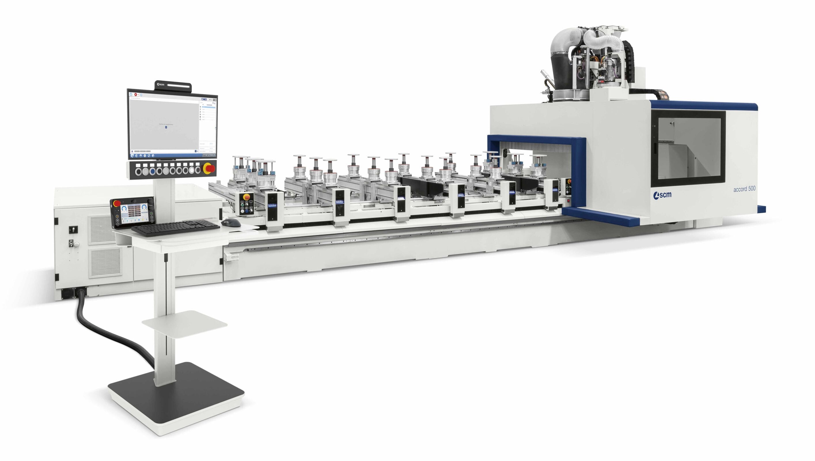 Die ACCORD 500 ist das Bearbeitungszentrum für Türen, Fenster, Treppen und Möbelteile – entwickelt für höchste industrielle Anforderungen. Mit einer leistungsstarken 5-Achs-Spindel von bis zu 20 kW und dank der sehr hohen Bearbeitungsgeschwindigkeiten mit über 100 verfügbaren Werkzeugplätzen meistert sie auch anspruchsvollste Anwendungen. Automatische Tischsysteme sorgen für schnelle Rüstzeiten, das Optizone-System ermöglicht eine flexible Aufteilung des Arbeitsbereichs. Die PRO-SPACE-Version bietet vollen 360°-Zugang ohne Schutzeinhausung – für maximale Produktivität und freien Zugang zur Maschine.