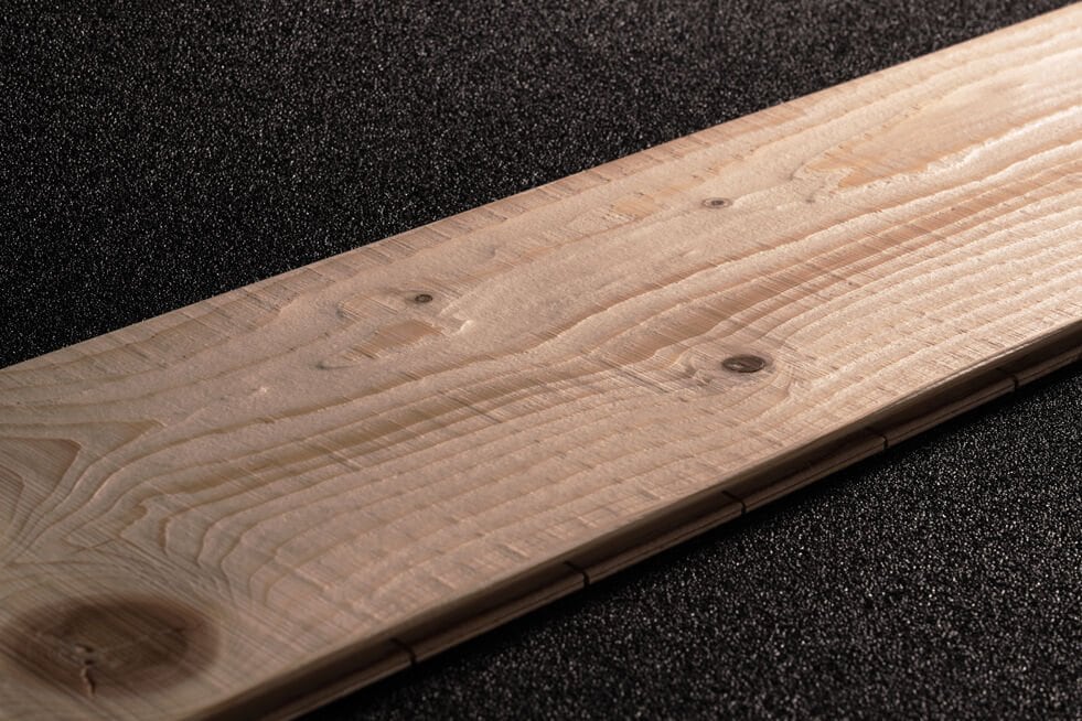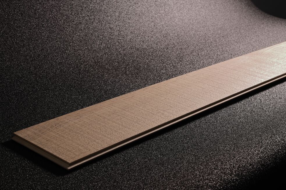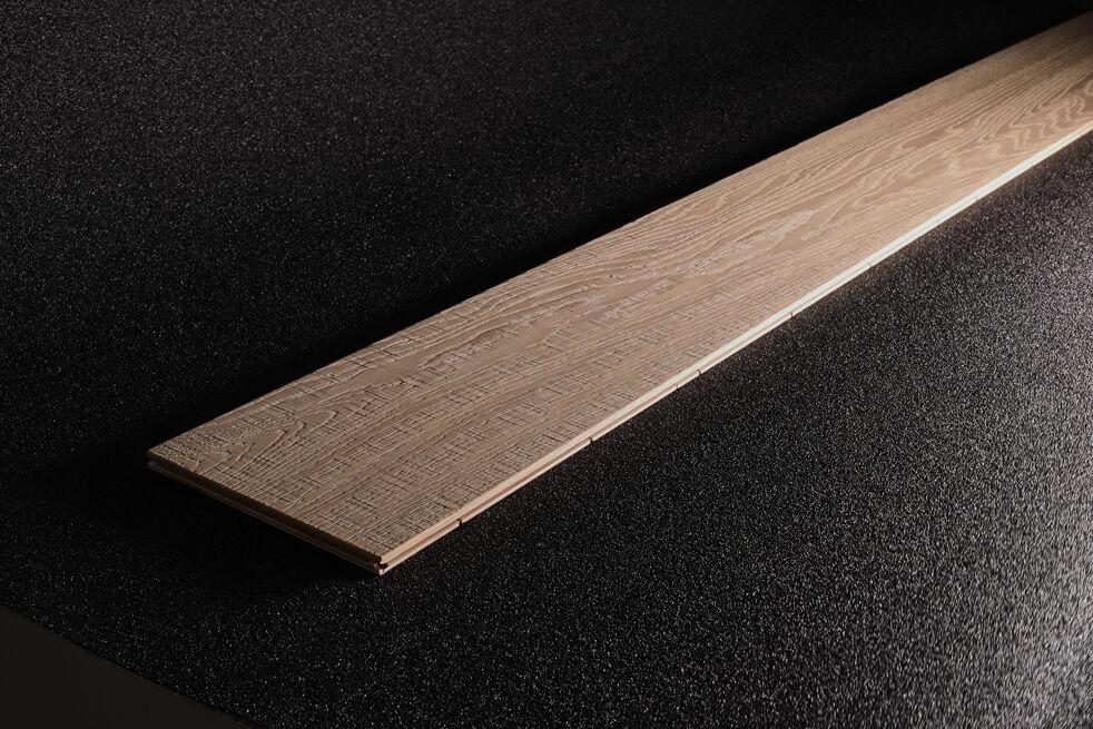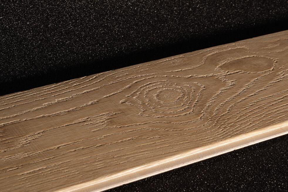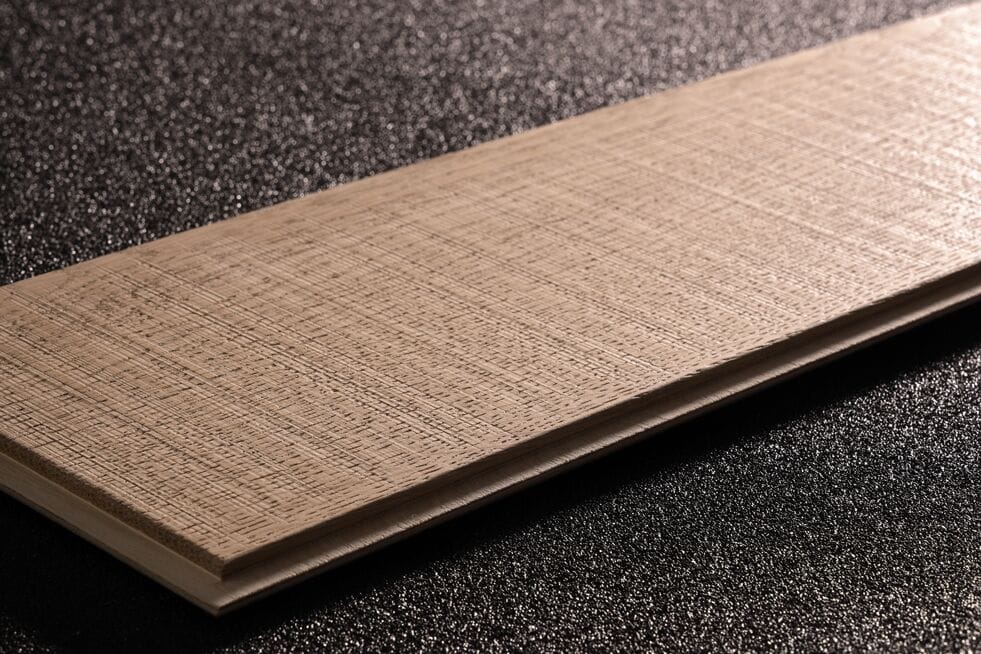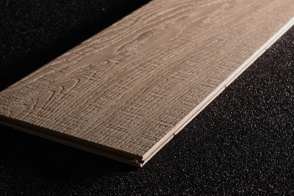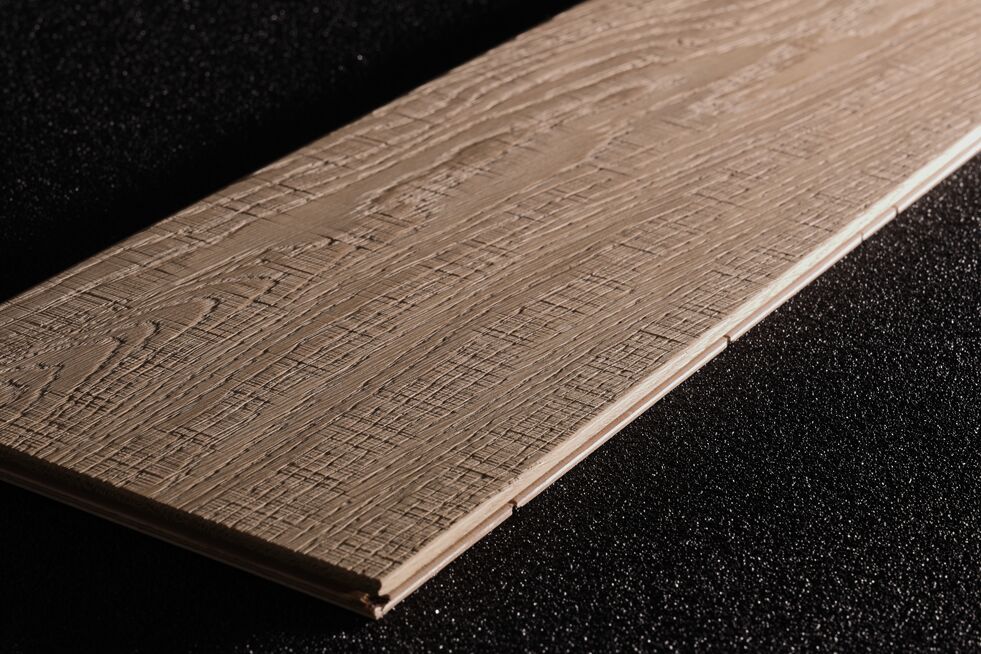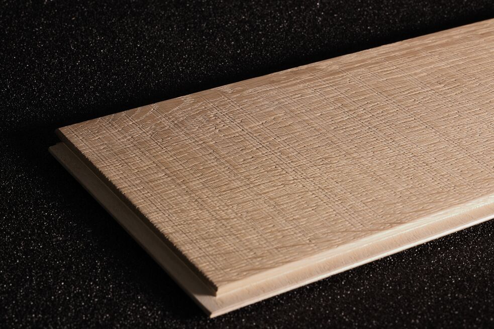 Oak wood flooring. The effect on the sample has been realised by the combined action of the cross belt unit with pad unit and the structuring brush.