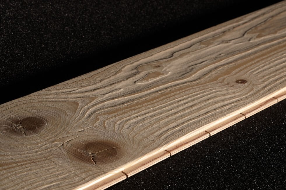 The effect on the sample has been realised by the combined action of the hand scraping unit with band saw unit and planetary unit; and lastly by the structuring brush unit.