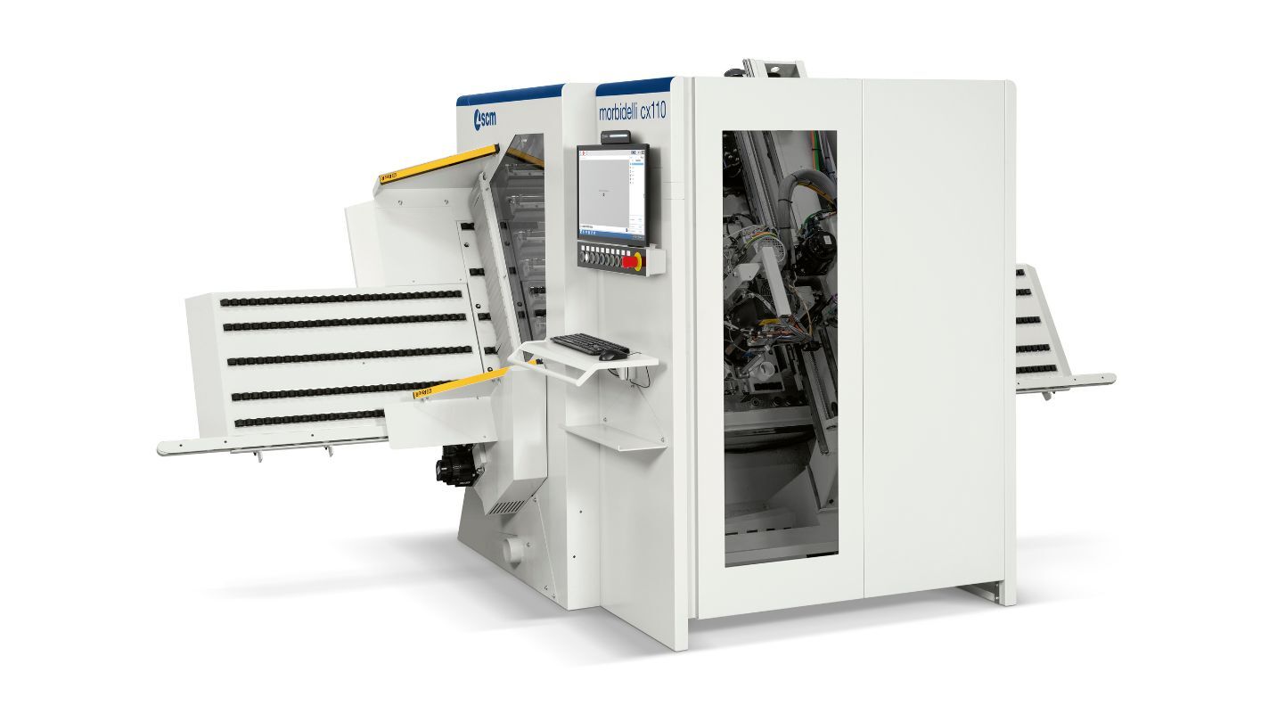 CNC drilling centre occupying only 10 square meters with a high rigidity Ro.Ax drilling head and routing unit with tool changer to meet any requirement of furniture maker. Workpieces unloading area integrable with panel return system or robot cell.