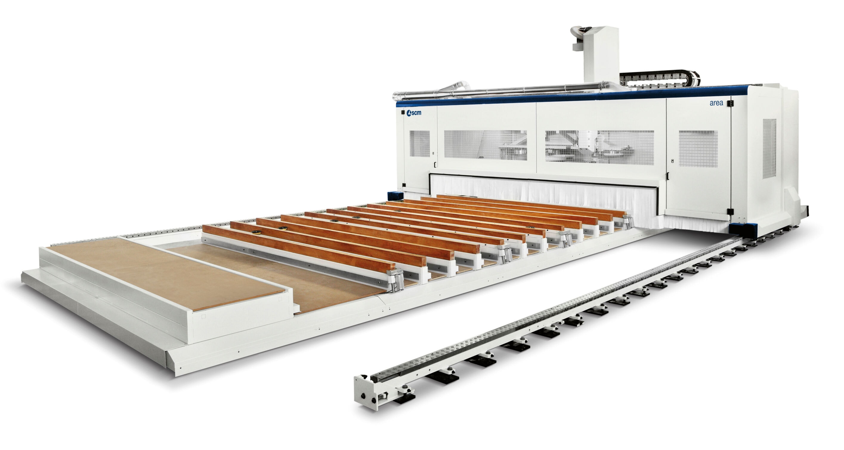 Il sera également possible de découvrir le modèle area. Il s’agit d’un innovant centre d'usinage à CN à structure à pont mobile et composition modulaire qui permet d’usiner des parois structurelles en bois. Il offre un plan de travail qui peut atteindre 4,5 mètres de large et 50 mètres de long. L’accès à celui-ci est facilité pour un chargement aisé des parois grâce à l'utilisation de rails de précision à bas profil vertical et un encombrement réduit. Il est aussi simple d’utilisation pour l’usinage d’éléments de forte épaisseur. L’utilisation de lame jusqu'à 1020 mm est permise avec le groupe opérateur à 5 axes spécialement conçu.