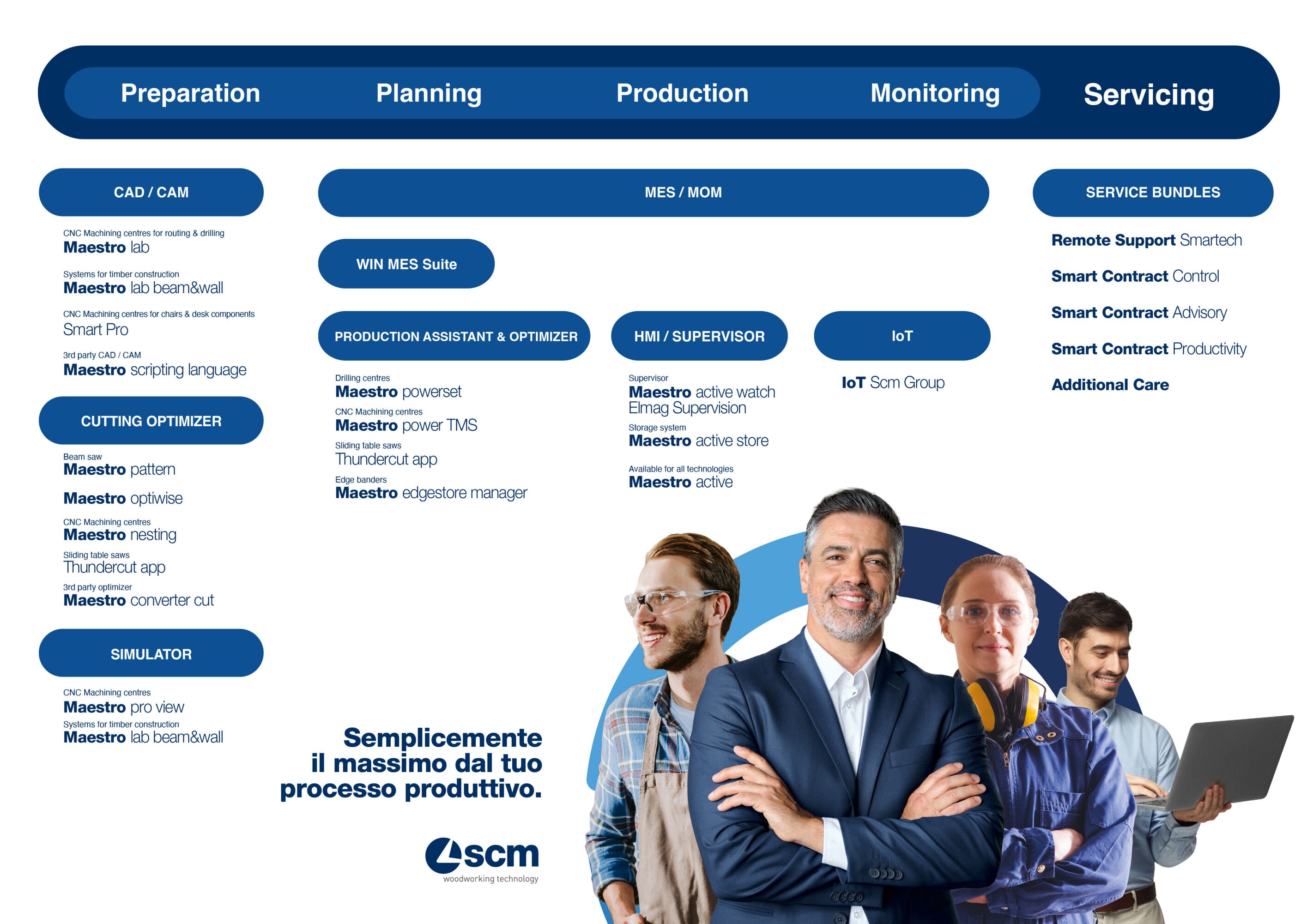 Il software SCM può interfacciarsi con qualunque soluzione MES per supportare il cliente nella programmazione e nella pianificazione della produzione. I software Maestro cnc e Maestro optiwise supportano le aziende del settore della lavorazione del legno nel design, nell'ottimizzazione e nella generazione dei dati. Maestro active, l'interfaccia uomo-macchina multi-touch avanzata, offre un controllo completo della produzione e una facile integrazione con la macchina. La piattaforma di servizi digitali Maestro connect consente il monitoraggio dello stato macchina, l'ottimizzazione della manutenzione, la gestione dei problemi, consigli per le parti di ricambio, smart learning nonché supporto all'assistenza con la realtà aumentata grazie agli occhiali Smartech.