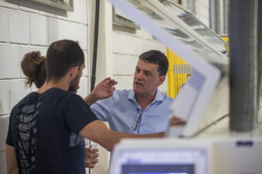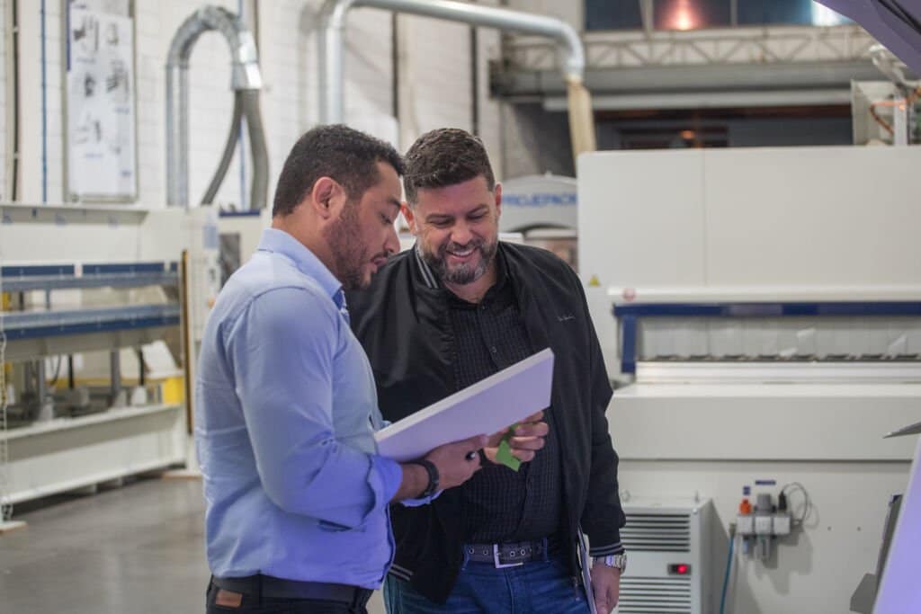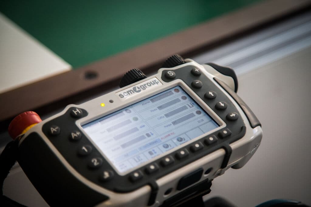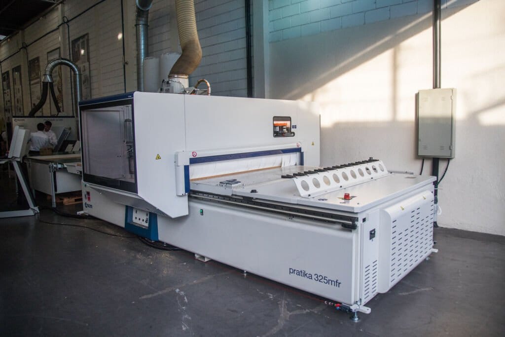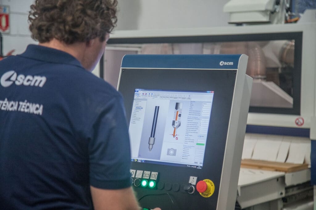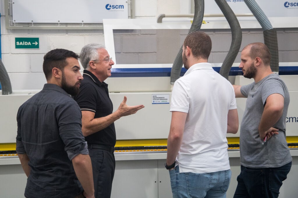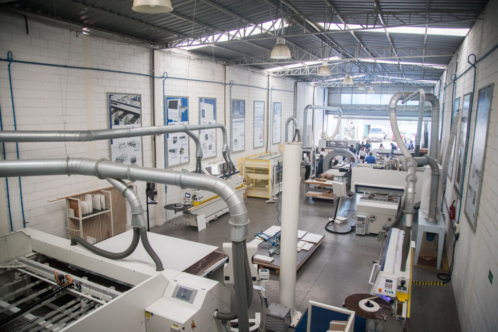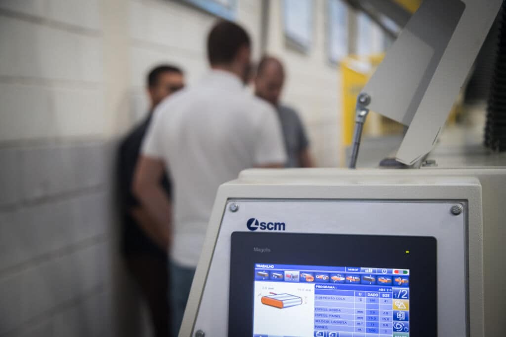 Ainda exibindo soluções em corte, colagem de bordos, furação e usinagem. Além, é claro, dos diferenciais quando o assunto é comunicação entre as máquinas e o mundo digital.